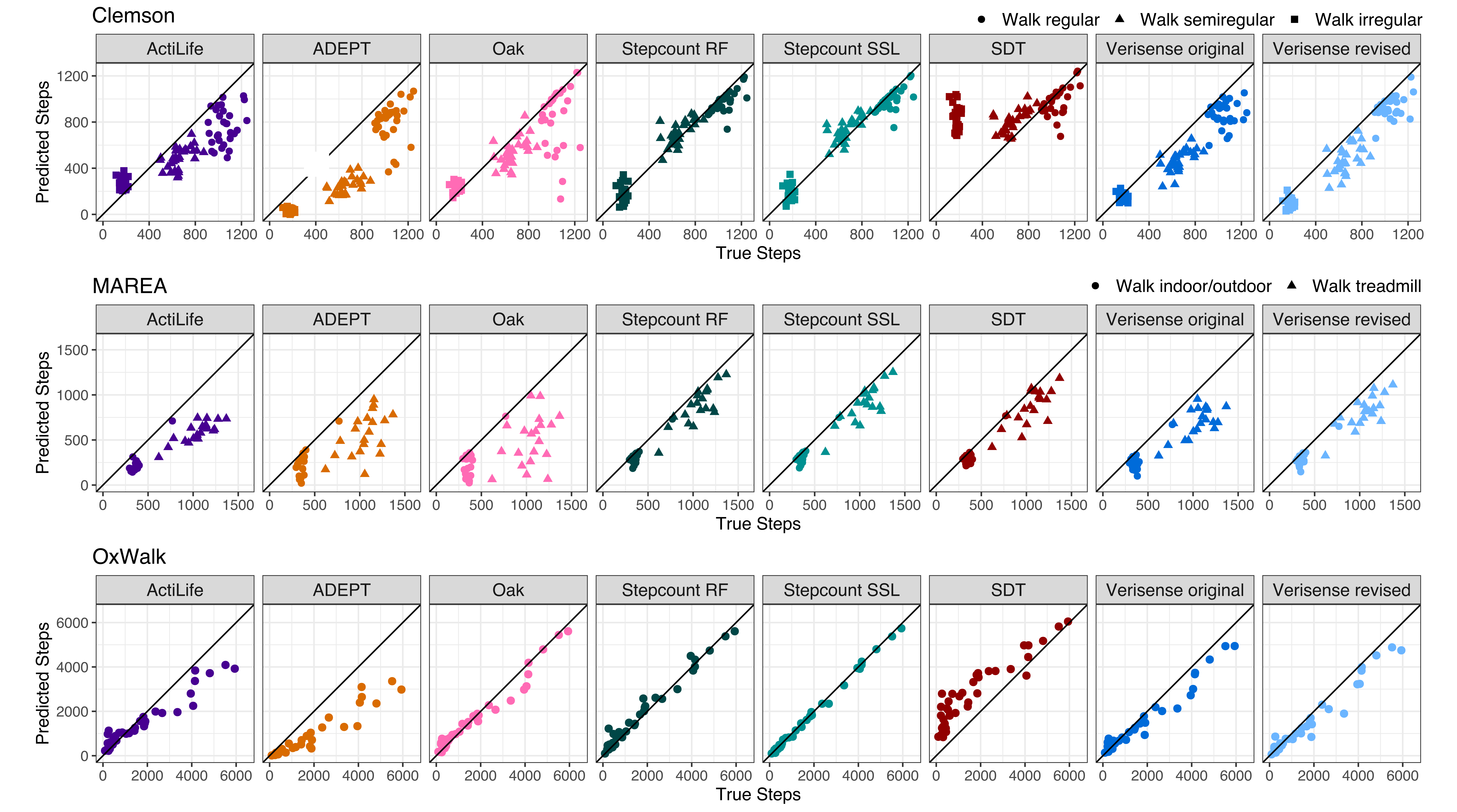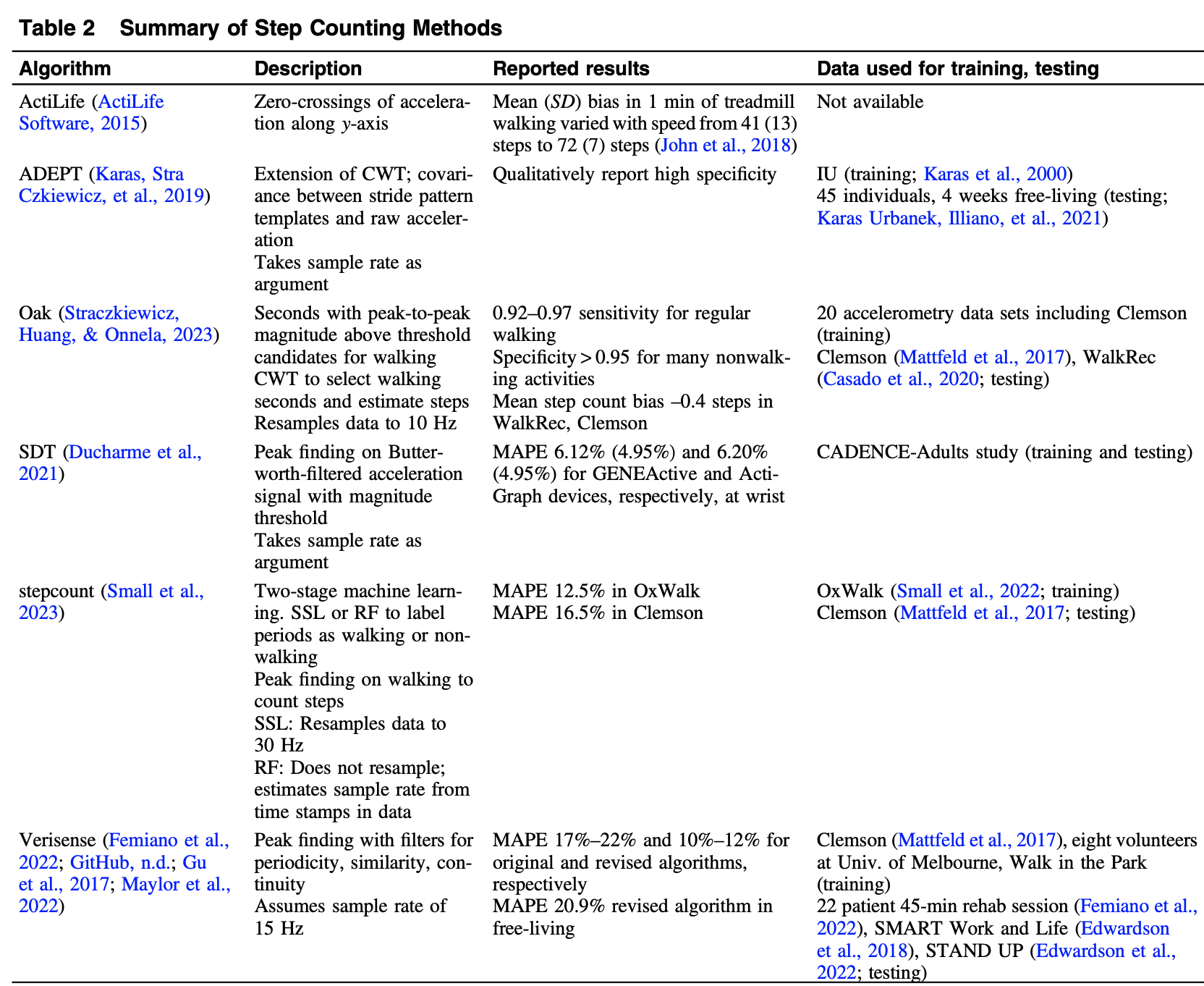Lily Koffman and Muschelli (2024) estimates steps using 3 gold standard data sets: OxWalk (S. R. Small et al. 2022), MAREA (Khandelwal and Wickström 2017), and Clemson (Mattfeld, Jesch, and Hoover 2017)