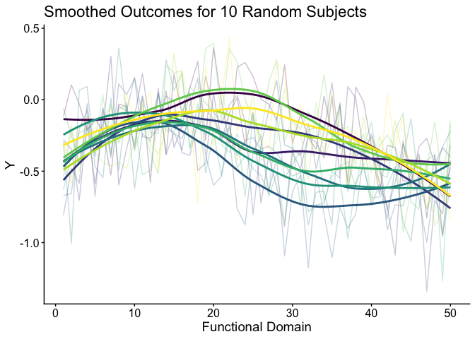 labs(x = "Functional Domain", y = "Y", title = "Smoothed Outcomes for 10 Random Subjects")